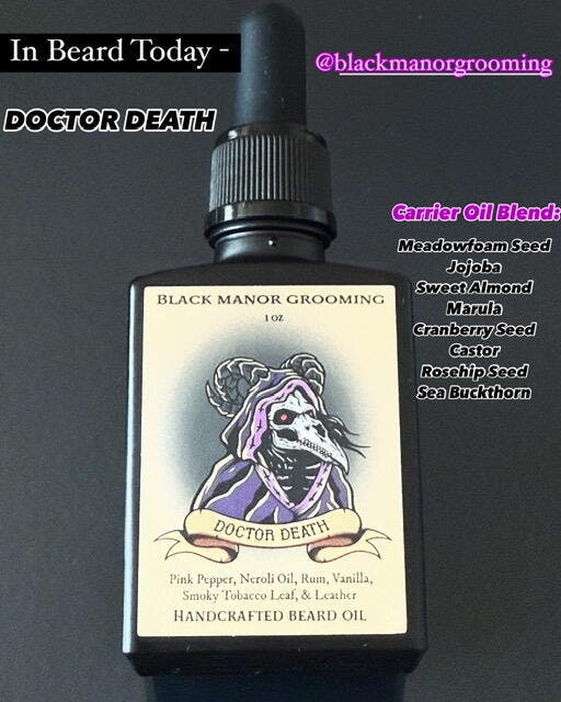 One of the best "feel in beard" experiences! Left the beard cottony soft, fluffy, light, with no oily or greasy residue. The packaging and company theme from Black Manor provides for a very cool unboxing. The scent I would call light to medium with a good 6 to 8 hour duration. This one is a luxurious, gentlemanly cologne that can be worn day or night. Very appropriate for intimate moments when you're looking for something refined, alluring, yet without being overbearing. Doctor Death is a pleasure to wear!