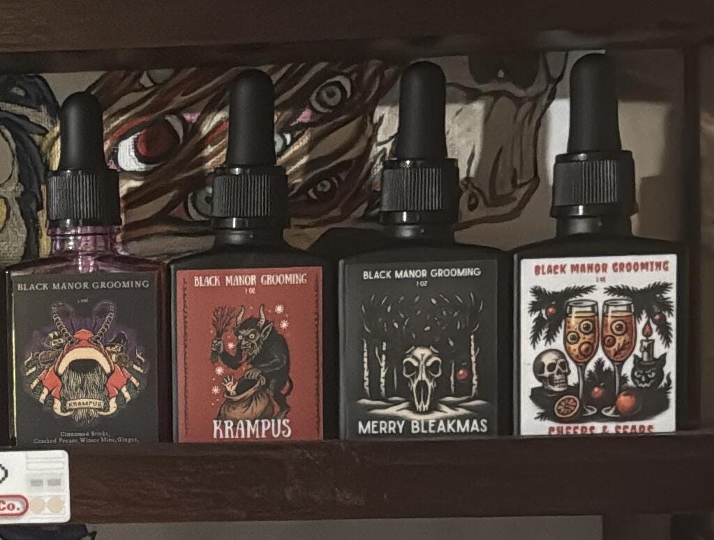 Truly enjoyable, long lasting, and definitely one of the stronger scents from Renee at Black Manor Grooming, Merry Bleakmas is a fun, unique and sophisticated take on a Christmas Holiday scent. It combines sweet, spicy, and tart elements of orange, maple, mulled fruits, clove, and cranberry with earthy, coniferous fir and smoky undertones, evoking feelings of warmth, comfort, and fond remembrances of bygone holidays. Multi - faceted, yet well balanced, the scent is as intriguing as it is inviting! Terri has raved about how this one smells in beard and how long the scent stays.